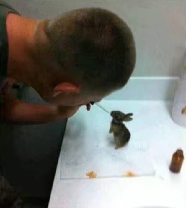 四隻小兔子依偎在奄奄一息的媽媽身邊,一個水兵發現了它們,便把它們帶回了家,並用吸管小心翼翼的喂食。