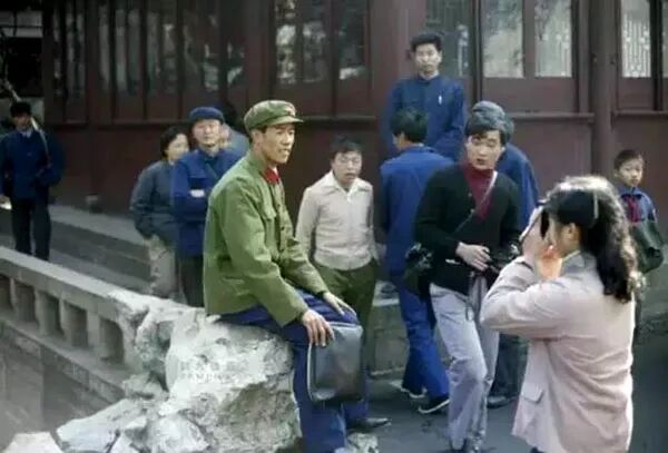 1980年,在北京的一個公園裏,一群時尚女性的飄逸發型。