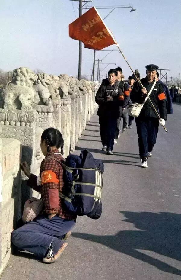 1966年,學生大串聯到盧溝橋,前隊的學生在橋上寫字給後隊提示方向。翁乃強/攝。