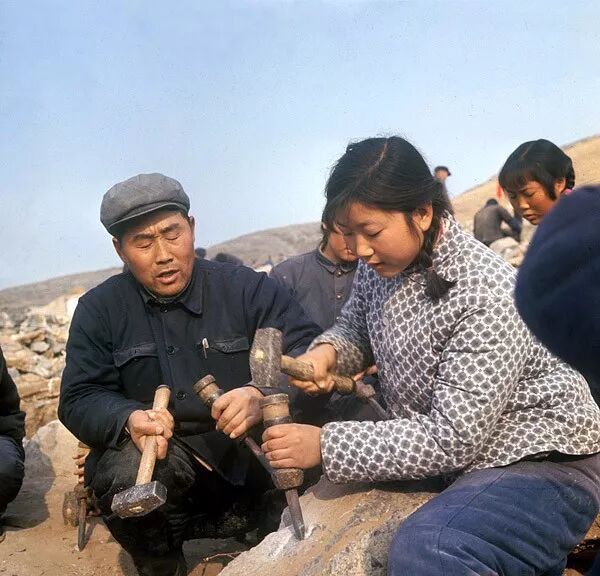1972年,河南輝縣書記鄭永和教女青年打石頭。翁乃強/攝。
