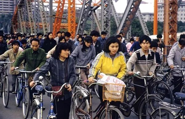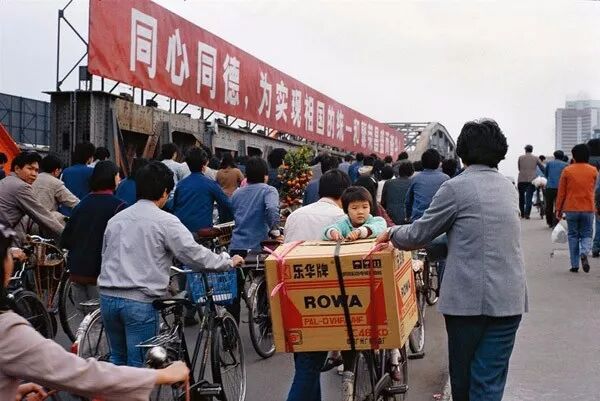 1980年代,一位市民把剛剛購買的彩色電視機放到自行車後座上拉回家。翁乃強/攝。