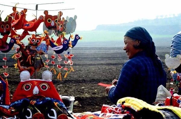 1980年代,西安秦始皇陵邊,婦女出售手工縫製的虎頭帽和掛件。翁乃強/攝。