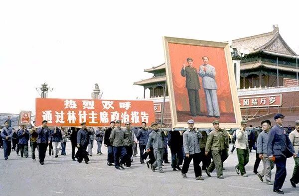 1966年,抬著毛主席和林彪的畫像遊行。翁乃強/攝。