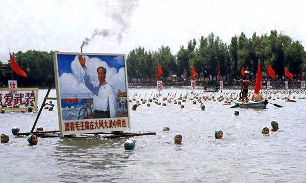 1966年,在遊泳活動中,“跟著毛主席在大風大浪中前進”的標語牌。翁乃強/攝。