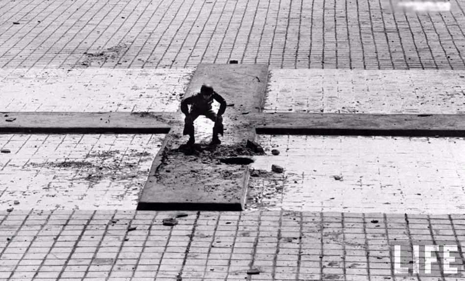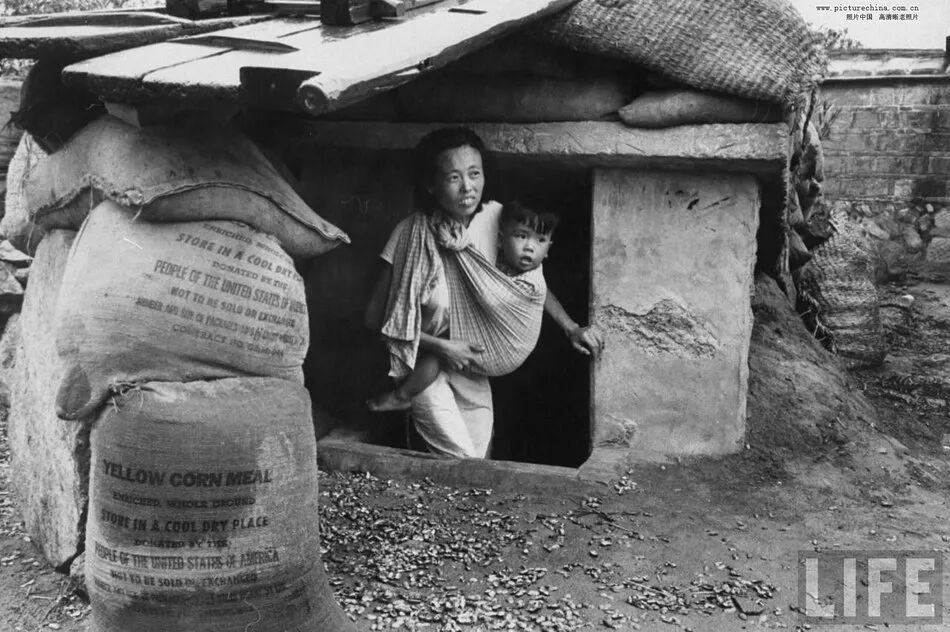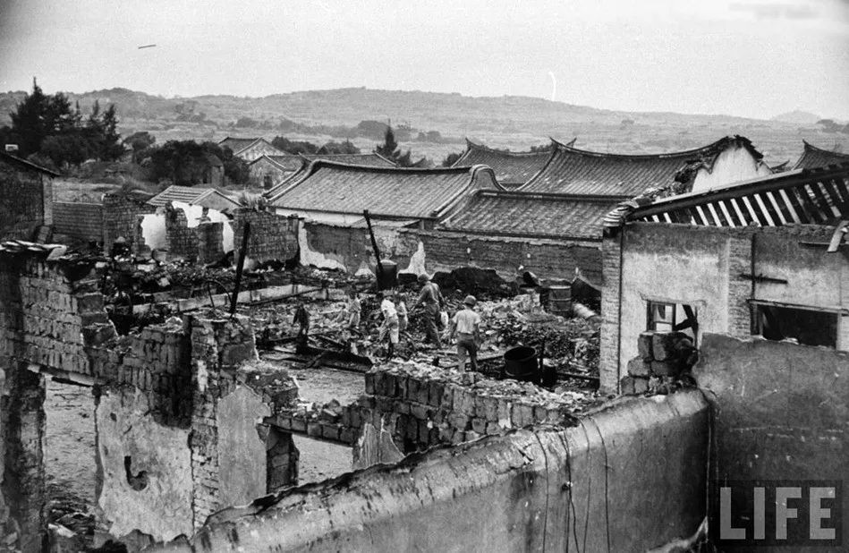 炮擊過後,在被炸毀的房屋裏尋找食物的金門婦女們。