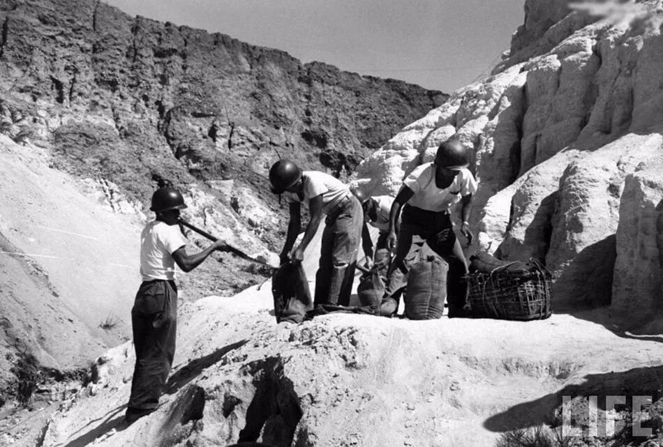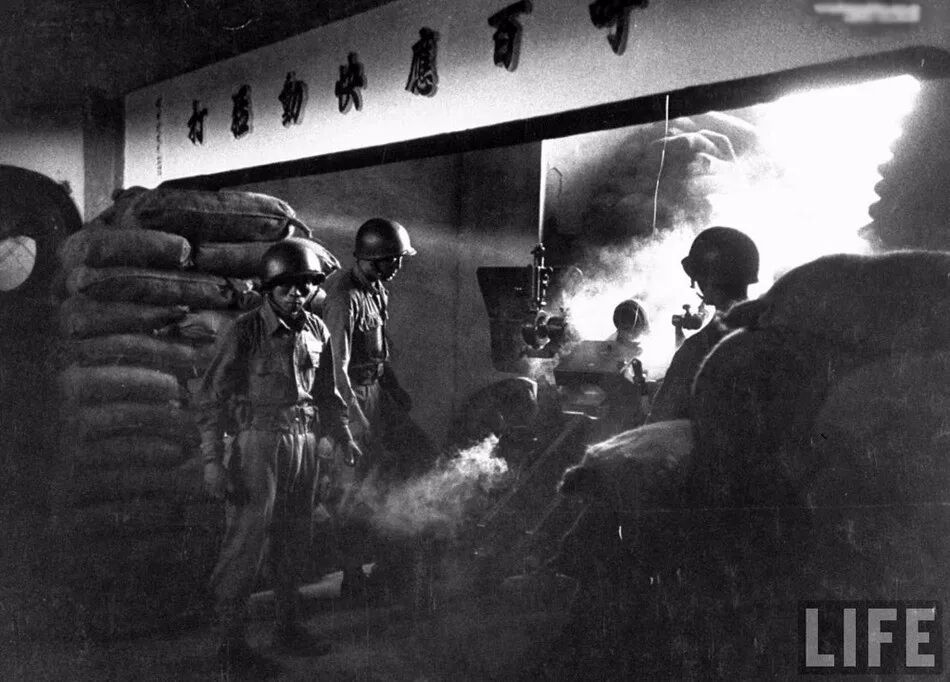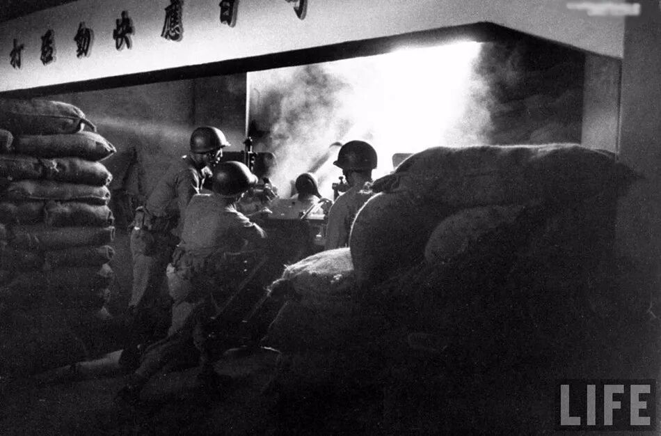 國軍士兵在金門島填充沙包,來阻擋共軍打過來炮彈。