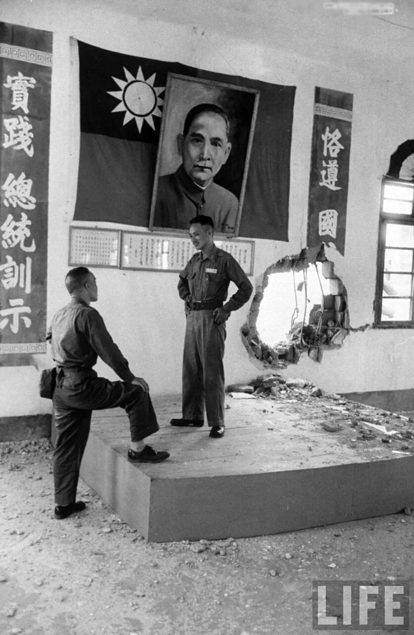 國軍軍官站在被共軍炮彈炸開了大洞的房間裏,牆上的國父孫中山的畫像毫發未損。