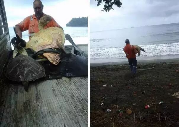 2、一位老人從市場裏買下海龜,送到大海放生。