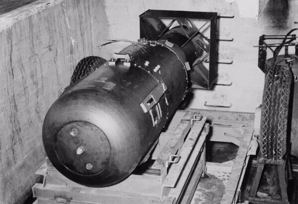 1945年8月,將被用作武器的第一個核裝置——代號“小男孩”——放置在拖車支架上,準備裝進“埃諾拉·蓋伊”號轟炸機的彈倉裏。
