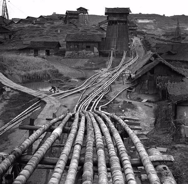 1938年4月,四川自貢,輸送鹽鹵的筧管與提升鹽鹵用的升鹵站。孫明經/攝。