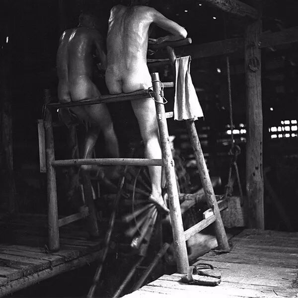 1938年4月,四川自貢,車鹽水的工人極為苦累,工作時一絲不掛渾身汗濕。孫明經/攝。