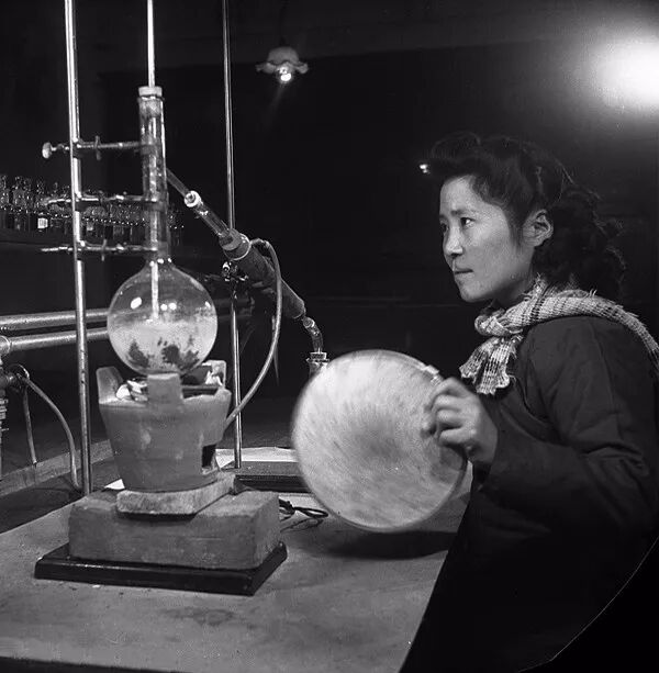 1944年2月,四川成都,金陵女大華西壩化學係試驗課,由於沒有酒精,做實驗時隻能用炭爐代替酒精燈。孫明經/攝。