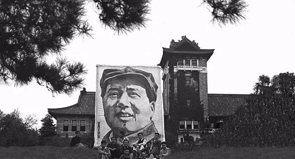 1949年5月,南京第一幅毛主席巨幅畫像,金陵大學影音部楊讚南教授遵孫明經主任安排繪成的巨幅毛主席像。孫明經/攝。