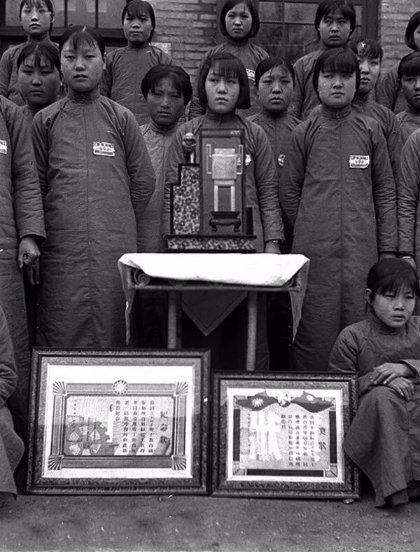 1937年3月,煙台蠶絲改良委員會青年女工工讀學會與所獲獎狀合影。孫明經/攝。