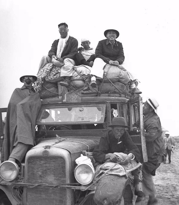 1937年7月15日,旅途中的西北科學考察團在包五路上。人多車小,有的團員們隻能坐在車頂和站在車邊。孫明經/攝。