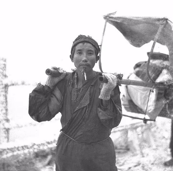 1939年7月,四川漢源縣大相嶺,7月山頂遍地冰雪,滑竿夫的胡須上居然掛著冰淩。孫明經/攝。