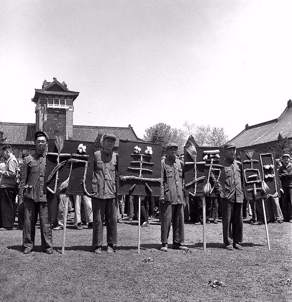 1951年5月1日,金陵大學工會全體會員出發參加五一勞動節遊行,農學院的標語與眾不同,用農作物製成的"抗美援朝"。孫明經/攝。