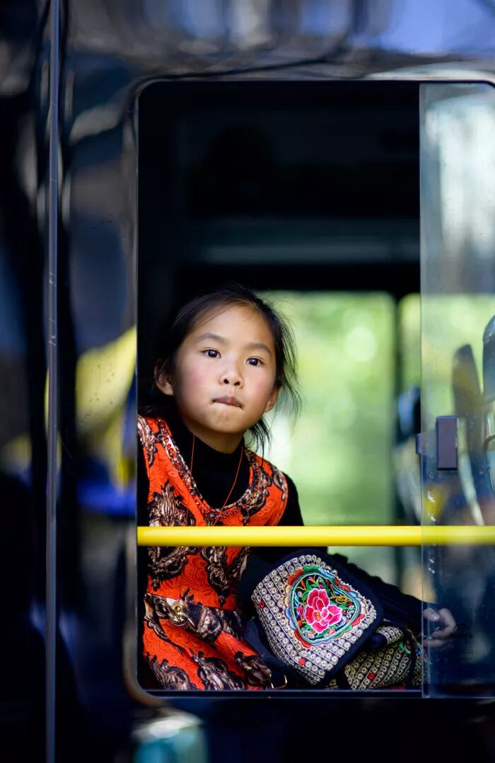 二月,昆明街頭,公交車上女孩。雲南的女生,許多都是皮膚黑得發亮,眼睛也是黑得發亮,很美。