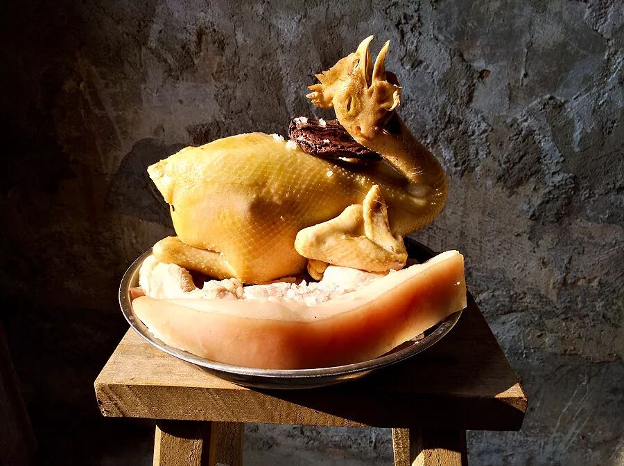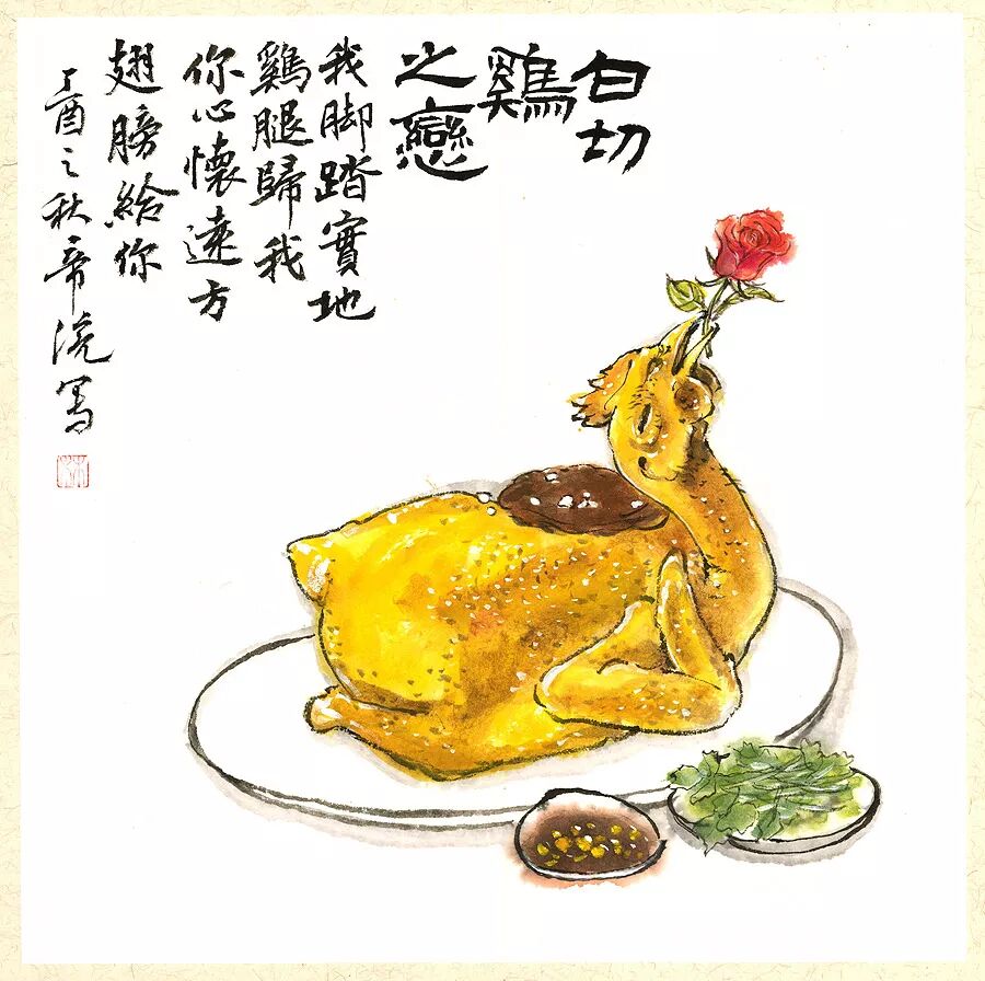 後來我對著這張拜神雞的照片,畫了一張“白切雞之戀”。