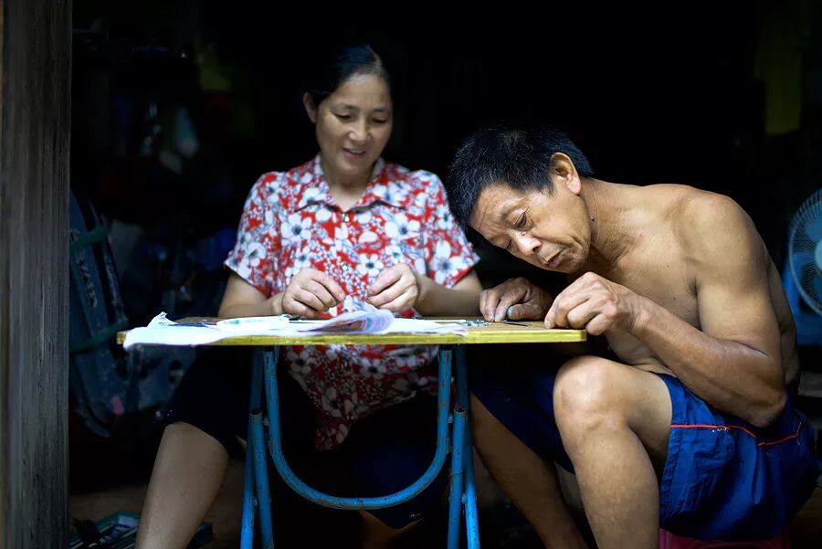一對中年外來工夫婦,趁著下班的休息時間,串表鏈賺些零花錢。