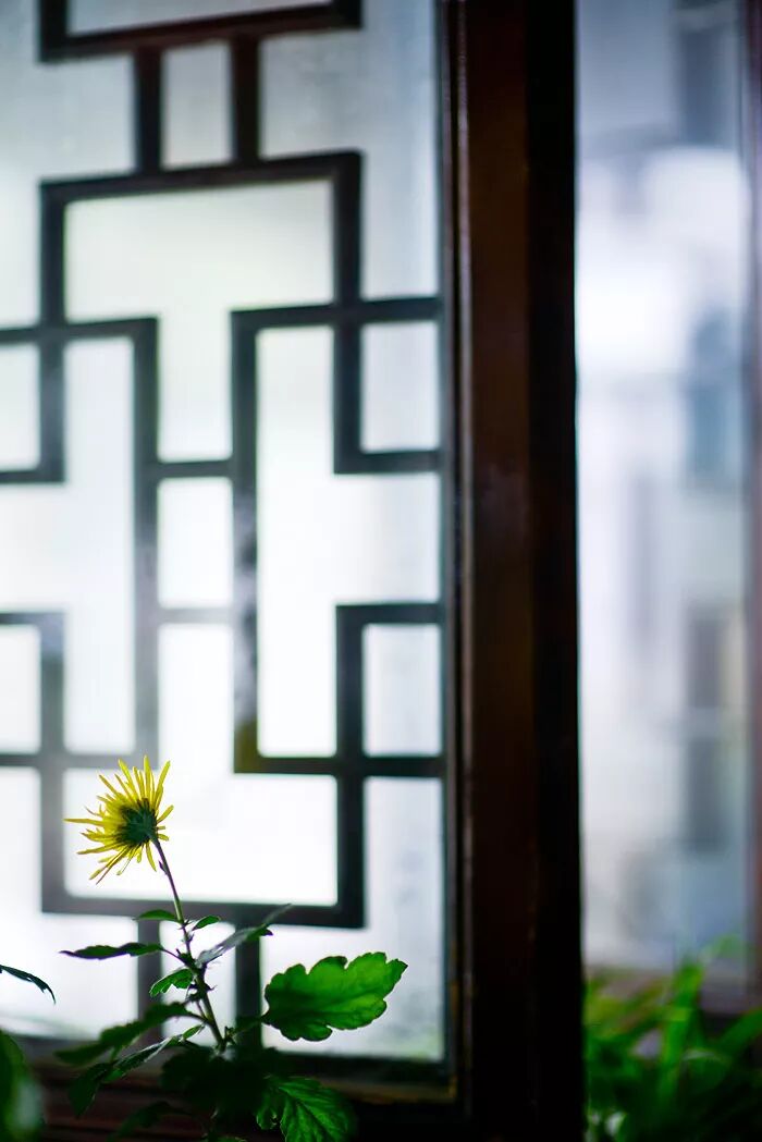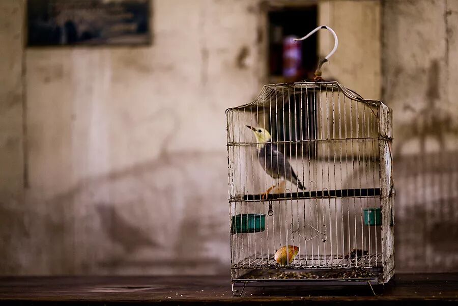昏黃燈光裏,籠中的鳥兒,也在斑駁的牆上,留下了自己的影子。