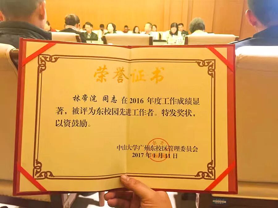 今年因為工作努力認真,還成了學校的先進工作者,拿這個獎,我媽應該很高興。