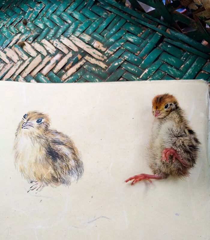 對著這隻雛鳥,趕緊畫了一張寫生,趕緊放回樹上窩裏。