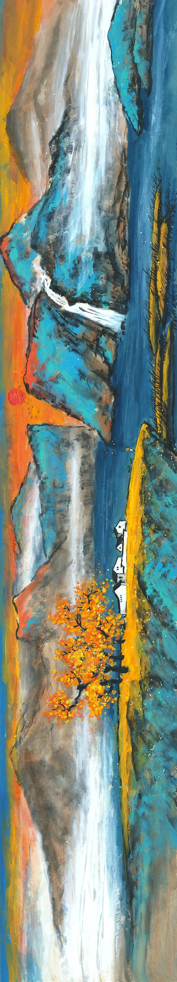 這副背景畫,有受最近熱門的千裏江山圖青綠風格的啟發,也加入西方印象派自由筆意的肆意,相當費顏料,畫完之後,整張宣紙重了好幾倍。