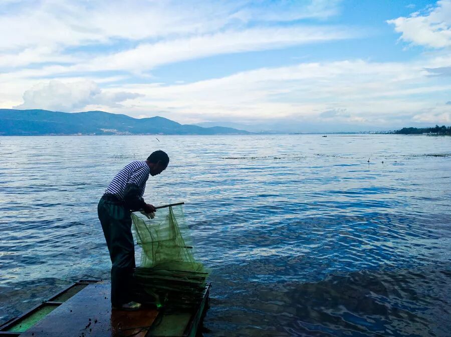 大理洱海邊,海西客棧,日落時分,漁民在收網,打上來許多小魚小蝦。