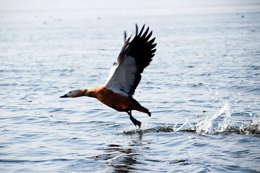 威寧草海,一隻赤麻鴨從清澈的水麵飛起。