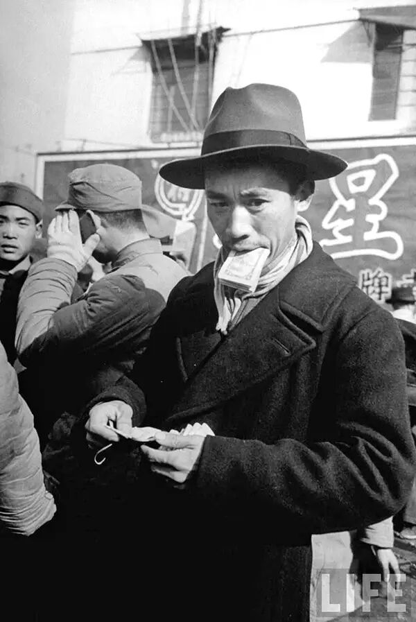 1949年2月,南京街頭數錢的中年男子。