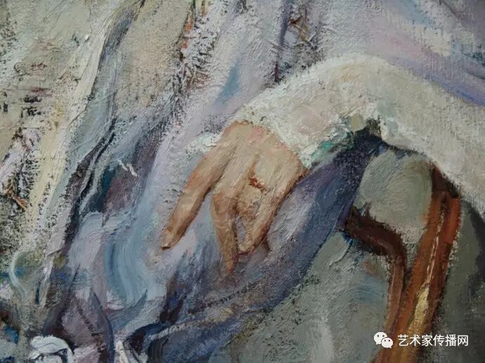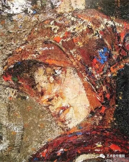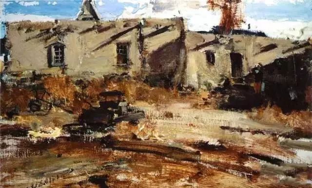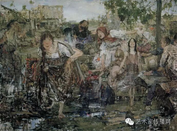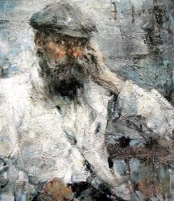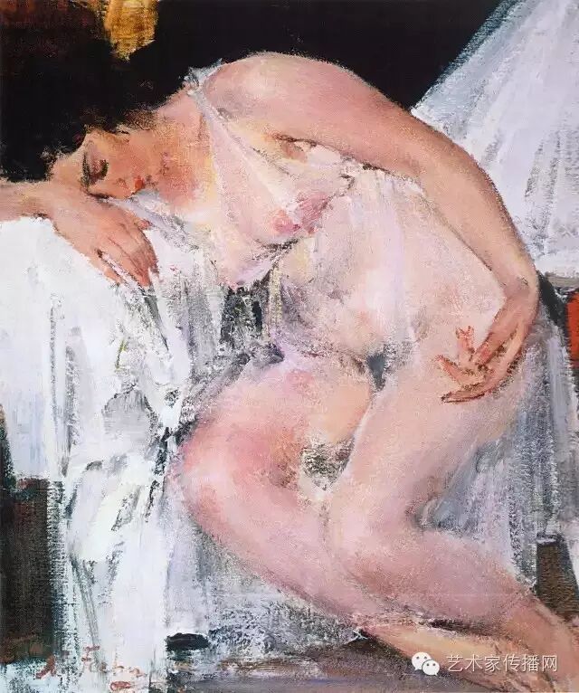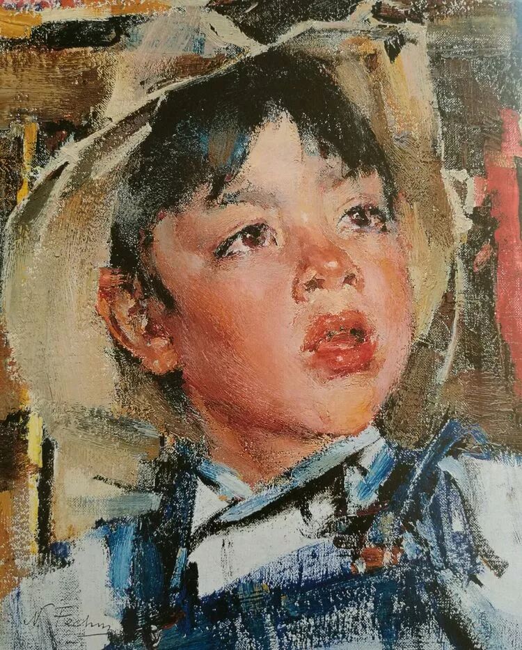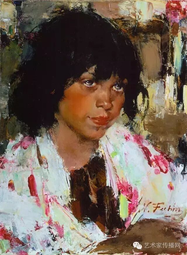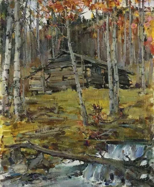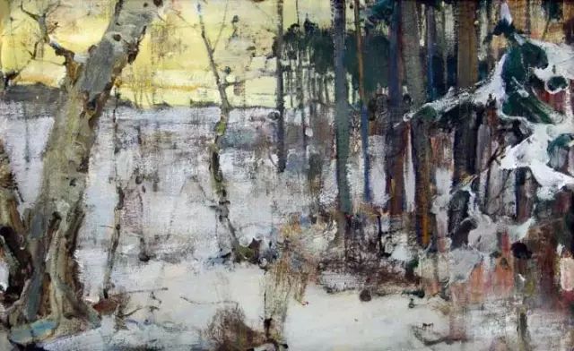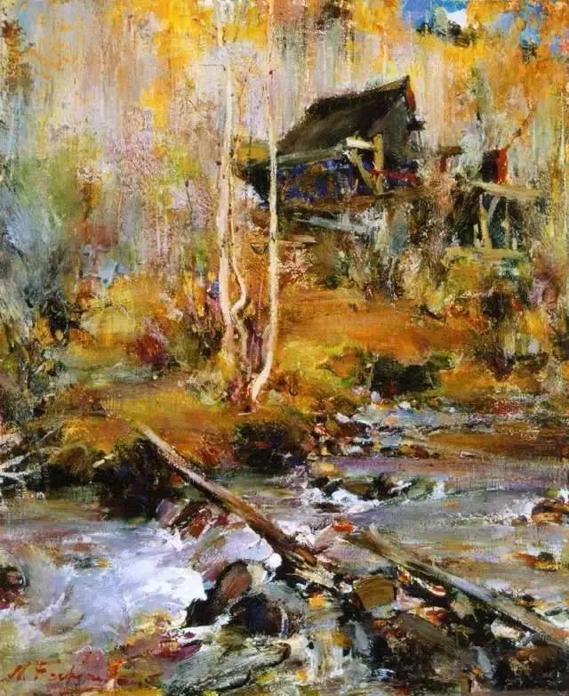 費欣畫畫不喜歡用單一的藝術表現手法,那散發著光彩的繪畫,帶有激情短促的筆觸和多層次粗糙的表麵是他長期藝術積累的結晶。一旦需要他就采用透明顏色調整色調的辦法,他用一層薄薄的顏色罩在另一層上,這個技法並不比17世紀西方人遜色。