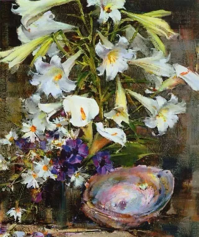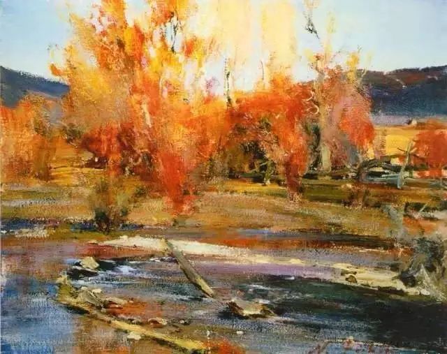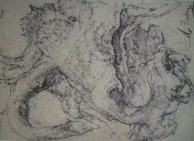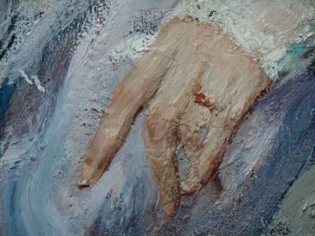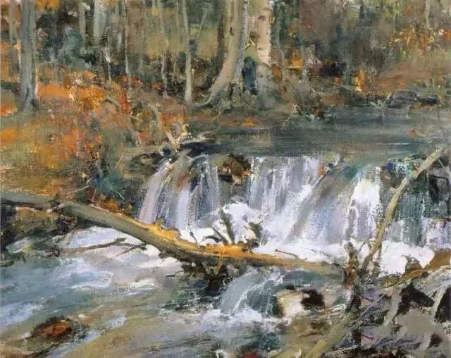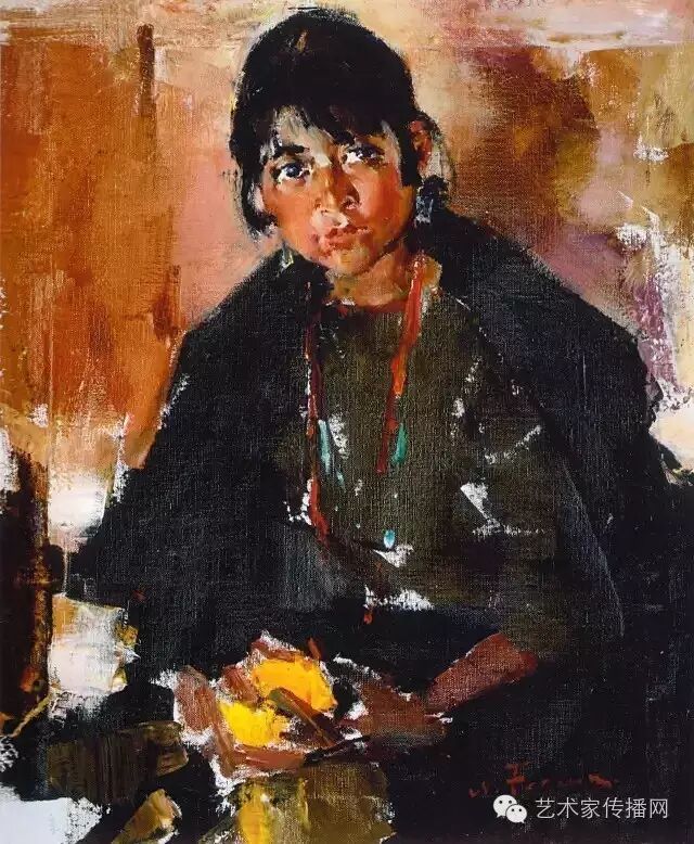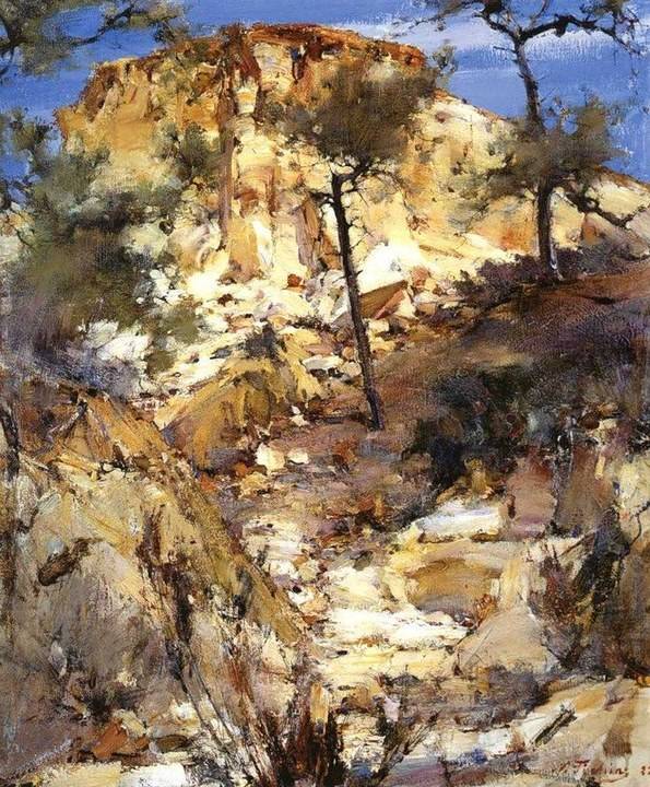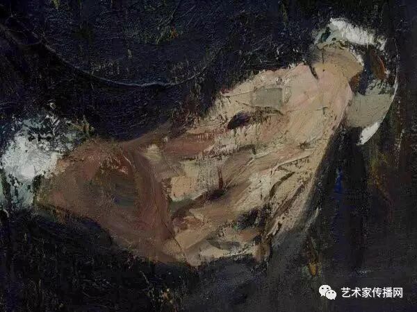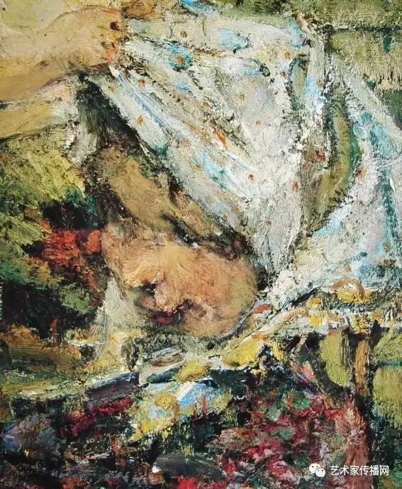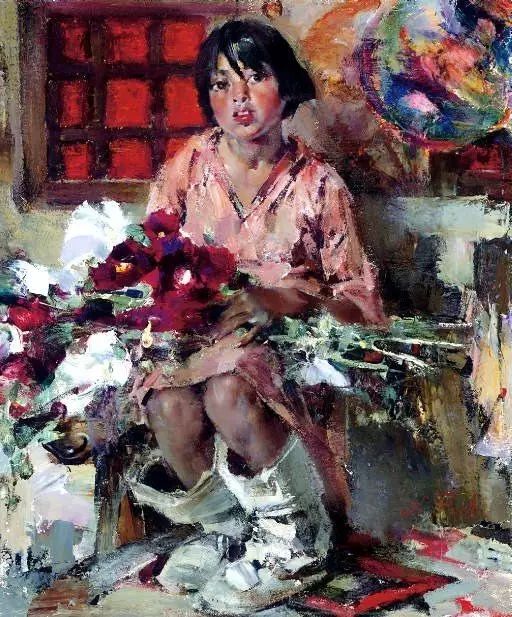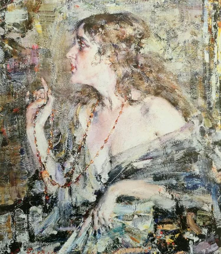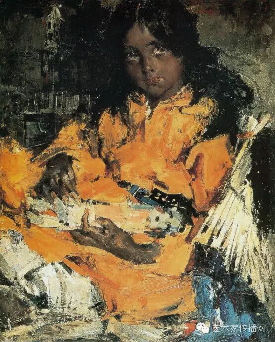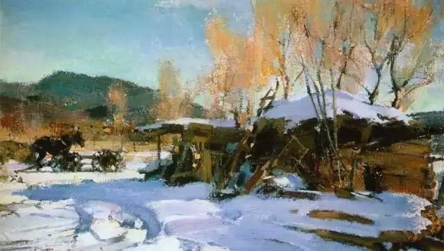 費欣畫畫不喜歡用單一的藝術表現手法,那散發著光彩的繪畫,帶有激情短促的筆觸和多層次粗糙的表麵是他長期藝術積累的結晶。一旦需要他就采用透明顏色調整色調的辦法,他用一層薄薄的顏色罩在另一層上,這個技法並不比17世紀西方人遜色。