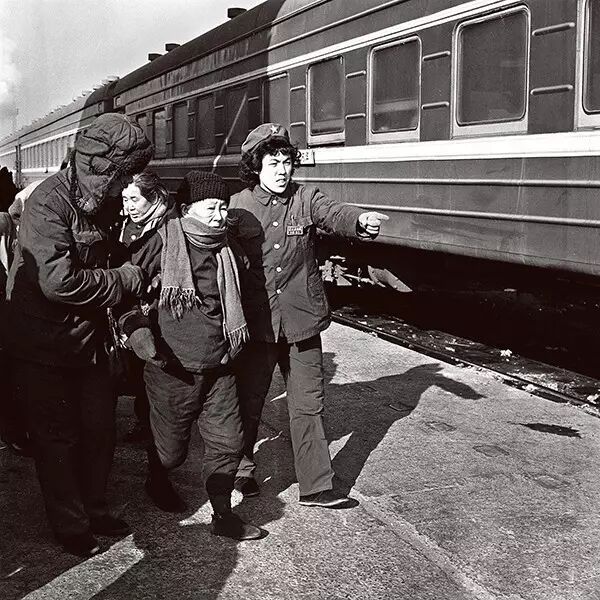 1978年,哈爾濱市三棵樹站,攙扶老人上車。