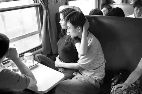1996年,從廣州-成都的列車上。擠在一個下鋪上的情侶,享受著片刻的甜蜜。