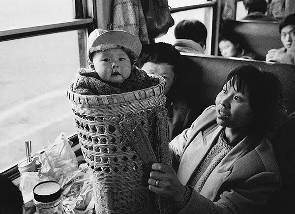 1996年,從廣州開往成都的列車上,一位母親小心地嗬護著放在背簍裏的孩子。