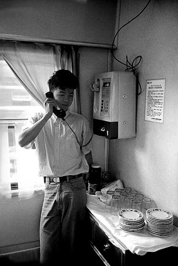 1999年,從北京開往哈爾濱的列車上,一個年輕人在餐車裏用磁卡打電話。