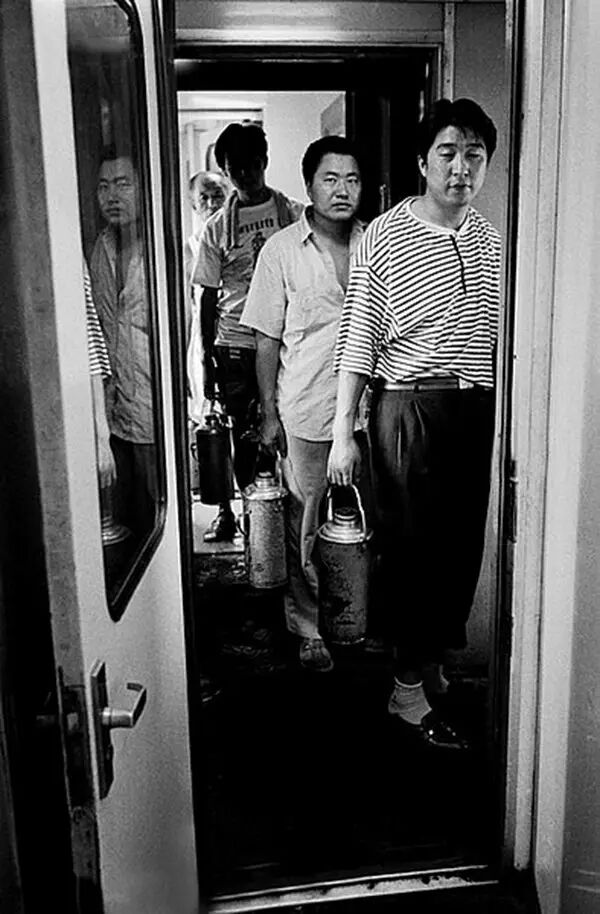 1991年,哈爾濱-上海的列車上,提著熱水瓶的乘客。