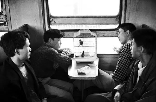 1995年,從哈爾濱開往五常的列車上,座位上的旅客饒有興趣地看著鳥籠裏的兩隻小鳥。