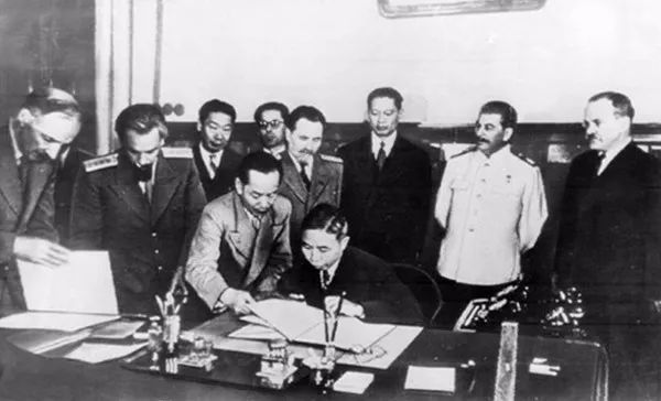 1945年,國民政府代表王世傑在莫斯科簽署中蘇友好同盟條約。