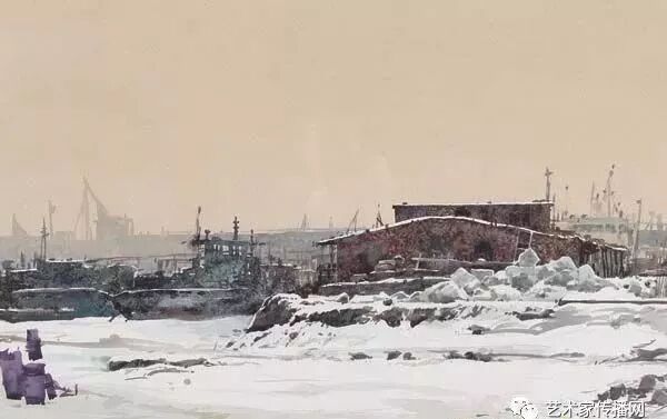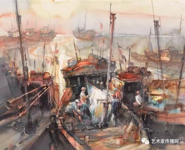 梁棟 港之晨 1957 28x40cm