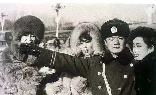 1986年,北京天安門廣場上的時裝模特與交通警察。