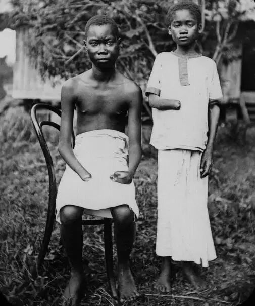 因為沒有收集足夠的橡膠而受到懲罰的黑人。比屬剛果,1908年