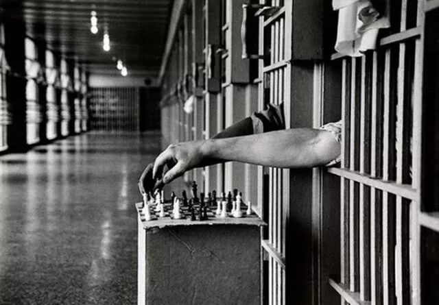 年代不可考,獄中象棋比賽,相鄰囚室的犯人在對弈。