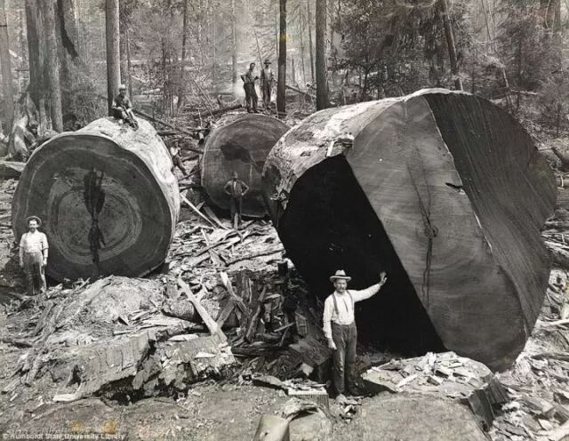 1915年,加州紅樹林裏的伐木工人。人與樹形成了鮮明的對比。
