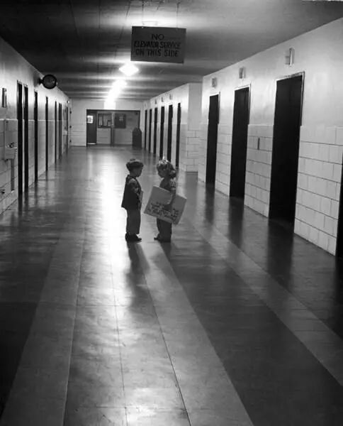 上世紀40年代,美國開辦p.s.600神童大學,招收3-11歲的超高智商兒童,兩個三歲的孩子(大學生)正在走廊上交談。