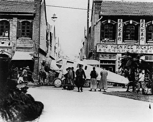 中國購買的飛機用繩子拉到漢口機場,途經一個小鎮時,與人力車行構成了顯明的對照。