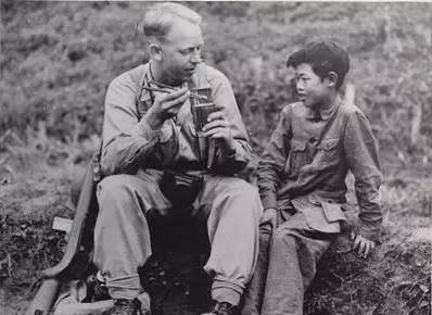 1944年5月6日,來自北達科他州的通信兵攝影師上等兵亞瑟.海吉(Pvt.Arthur W.Hedgo)在CBI(中緬印戰區) 戰場用中國筷子吃他的美國幹糧,身旁的小孩李田右(音:Lee Ting Yow)在教他使用筷子。海吉是在前線拍攝中國軍隊戰地影片的途中停下來休息時吃他的食品的。