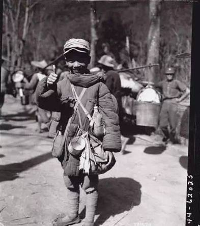 1944年11月23日,李占宏(音Lee Chan-Hon)剛剛年滿13歲,盡管已經在中華民國國軍隊裏服役兩年,仍然是稚氣十足,麵對鏡頭作微笑狀。(美軍通信兵(U.S.Army Signal Corps)拍攝)