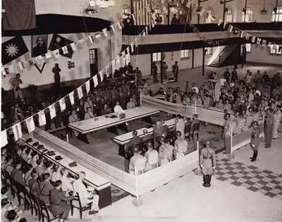1945年9月9日,中國南京,從南京中央軍事科學院的陽台上拍攝的日軍簽署投降書的長鏡頭。